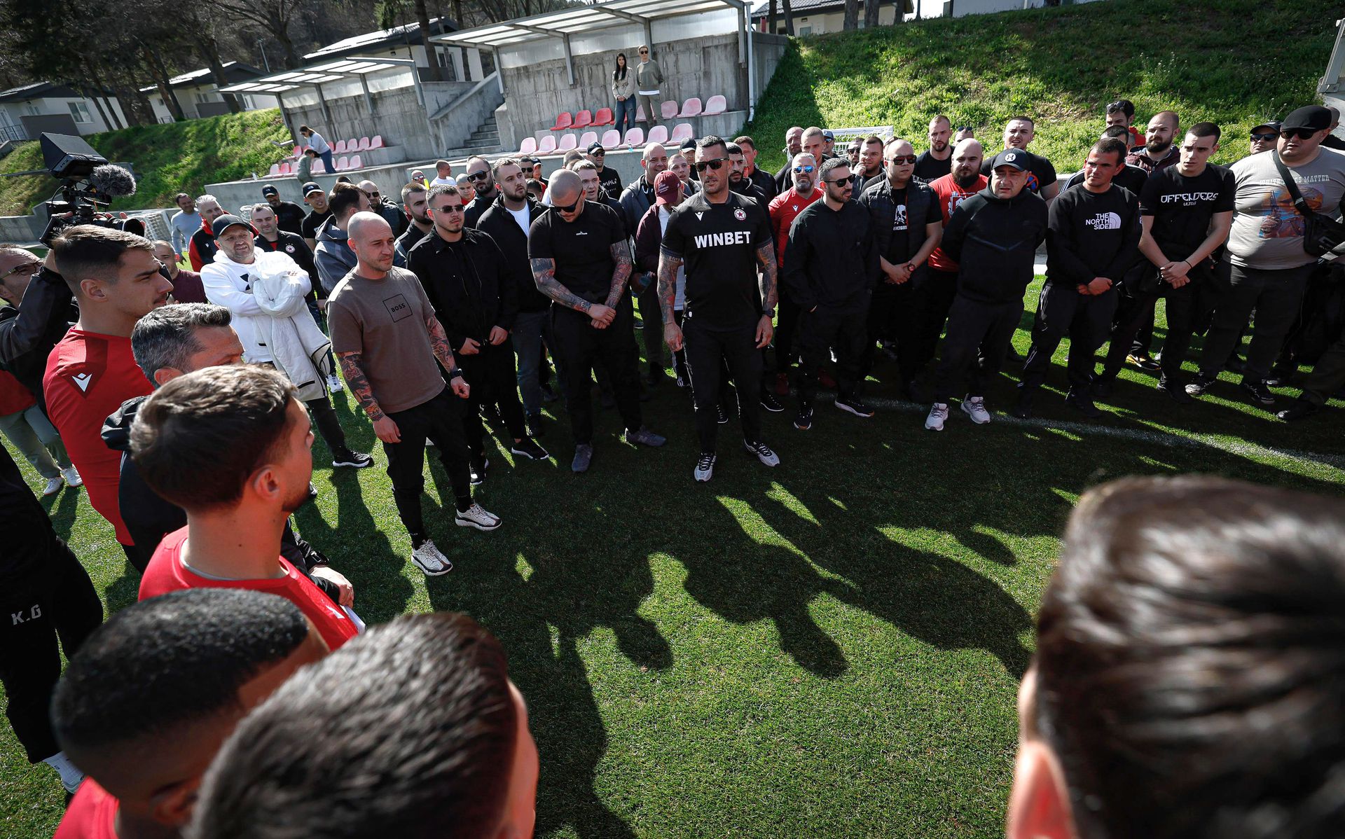 Лидерът на Сектор Г – Иван Велчев – Кюстендилеца държа реч пред треньорския щаб на Христо Янев и футболистите на „червените“.