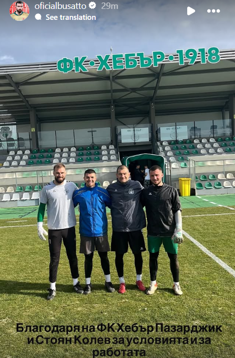 “Благодаря на ФК Хебър Пазарджик и Стоян Колев за условията и за работата”, написа 35-годишният вратар към снимката.