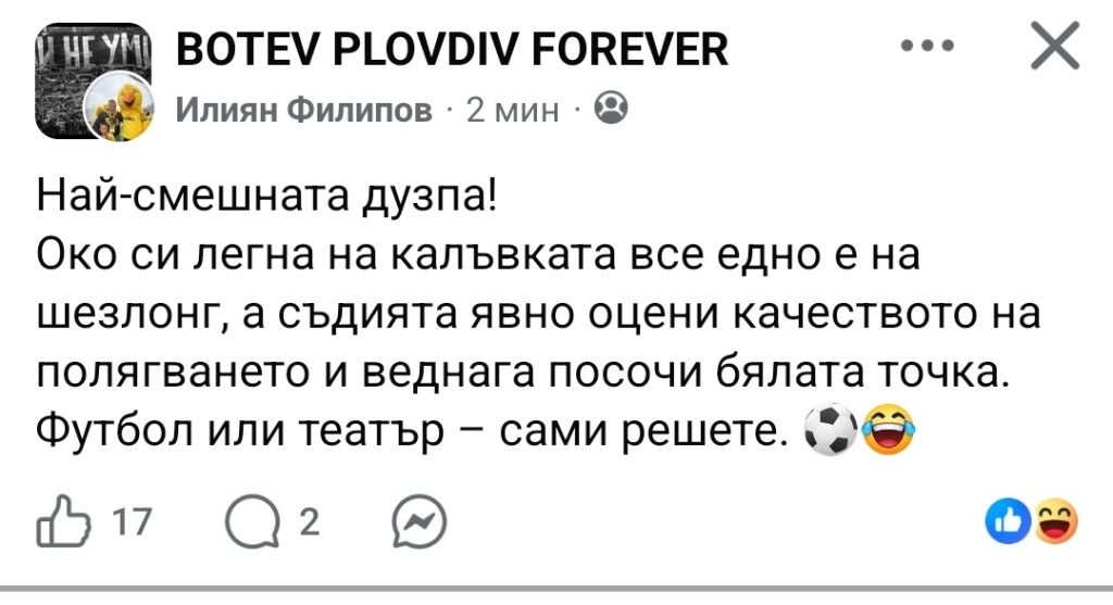 Футбол или театър – сами решете“, написа Филипов в една от големите групи с привърженици на Ботев Пловдив.