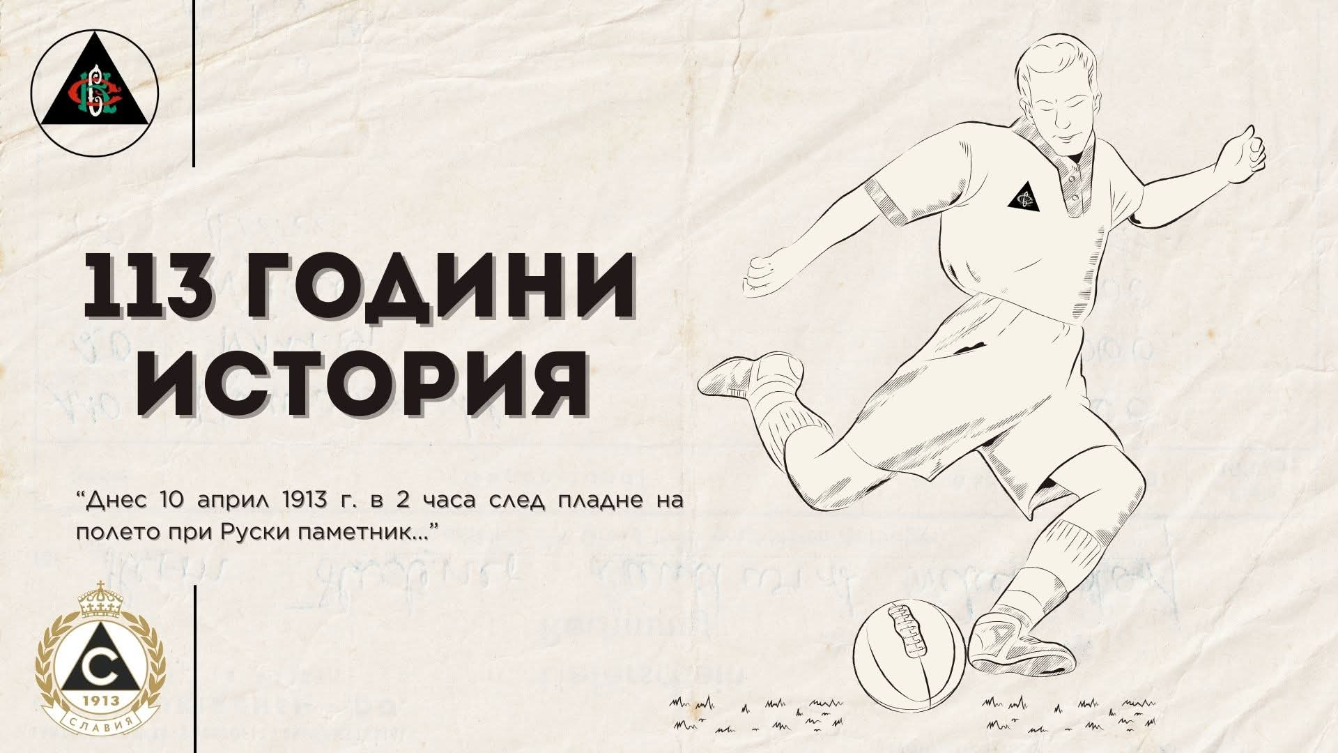 Най-старият столичен футболен клуб Славия отбелязва днес 113 години от създаването си на 10 април 1913 година. „Бялата“ история започва на този ден около 14 часа следобяд край тогавашното поле на Руски паметник.